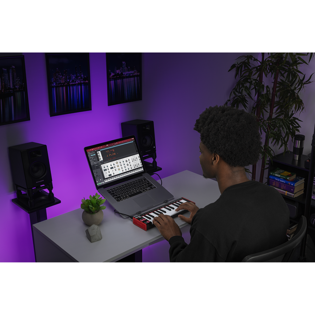 Quelque soit le lieu ou le moment où votre inspiration s’éveille vous pouvez sortir le LPK25 de votre sacoche et contrôler virtuellement n’importe quel logiciel dans la seconde.