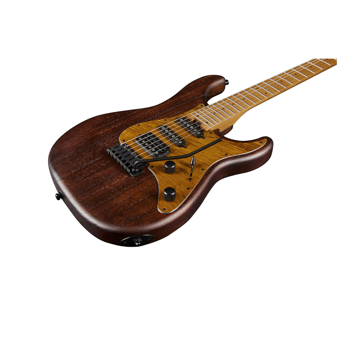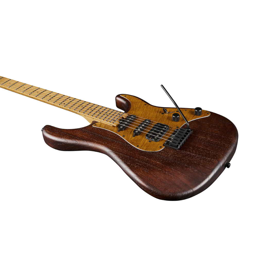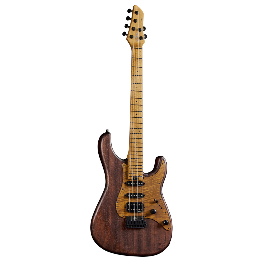 La lutherie des guitares Wildwood a bénéficié de la plus grande attention pour restituer au mieux l’authenticité de la matière du bois, et sa chaleur visuelle et sonore. Le corps est sculpté en paulwonia, un bois léger, résonnant et élégant dans son veinage. Le manche en érable torréfié, vissé 5 points, robuste et confortable, est surplombé d’une touche en érable torréfié de 24 cases apportant confort et brillance pour vos solos les plus aigus. Le tremolo Eko Steel intègre des pontets réglables indépendamment pour ajuster au mieux l’action et l’harmonique de chaque corde. Les mécaniques à blocage en configuration 4+2 assurent la stabilité de l’accordage et de vos notes. La teinte naturelle « roasted » du corps s’accorde joliment avec l’accastillage noir. Enfin, le vernis satiné « open pore » laisse transparaitre la beauté brute et naturelle du veinage.