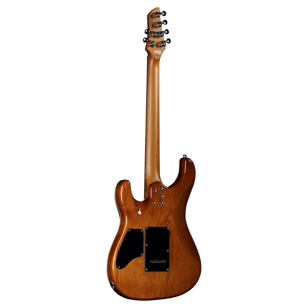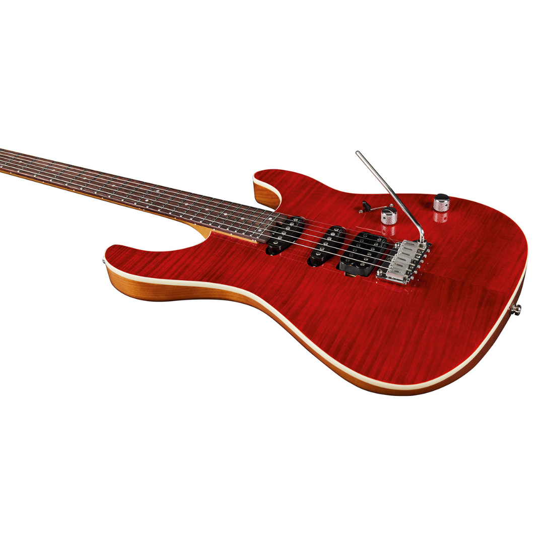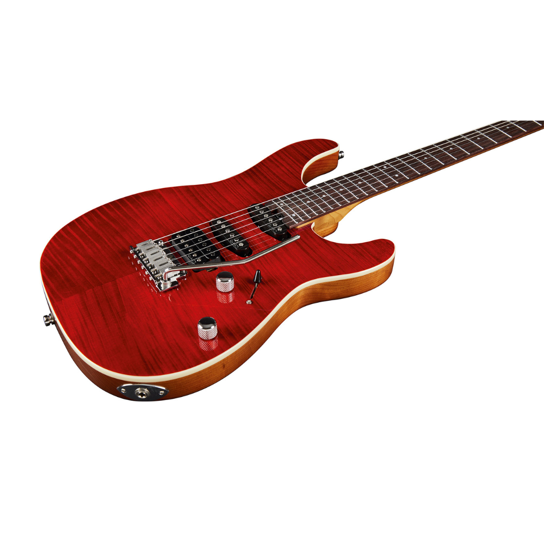 La lutherie des guitares Musa est de très haute qualité dans le but d’inspirer les guitaristes, et leur permettre d’exprimer leur meilleur d’eux-mêmes avec confort et performance. Le corps est composé d’aulne massif surmonté d’une table en érable canadien flammé, du plus bel effet. Le manche en érable torréfié, vissé 5 points, robuste et confortable, est surplombé d’une touche en palissandre de 24 cases apportant confort et chaleur pour vos solos les plus aigus. Le tremolo Eko Steel HRC57 intègre des pontets réglables indépendamment pour ajuster au mieux l’action et l’harmonique de chaque corde. Les mécaniques à blocage en configuration 4+2 assurent la stabilité de l’accordage et de vos notes. Enfin, la finition rouge brillant est présente sur la table, ainsi que sur le devant de la tête, afin de magnifier avec élégance l’érable flammé.