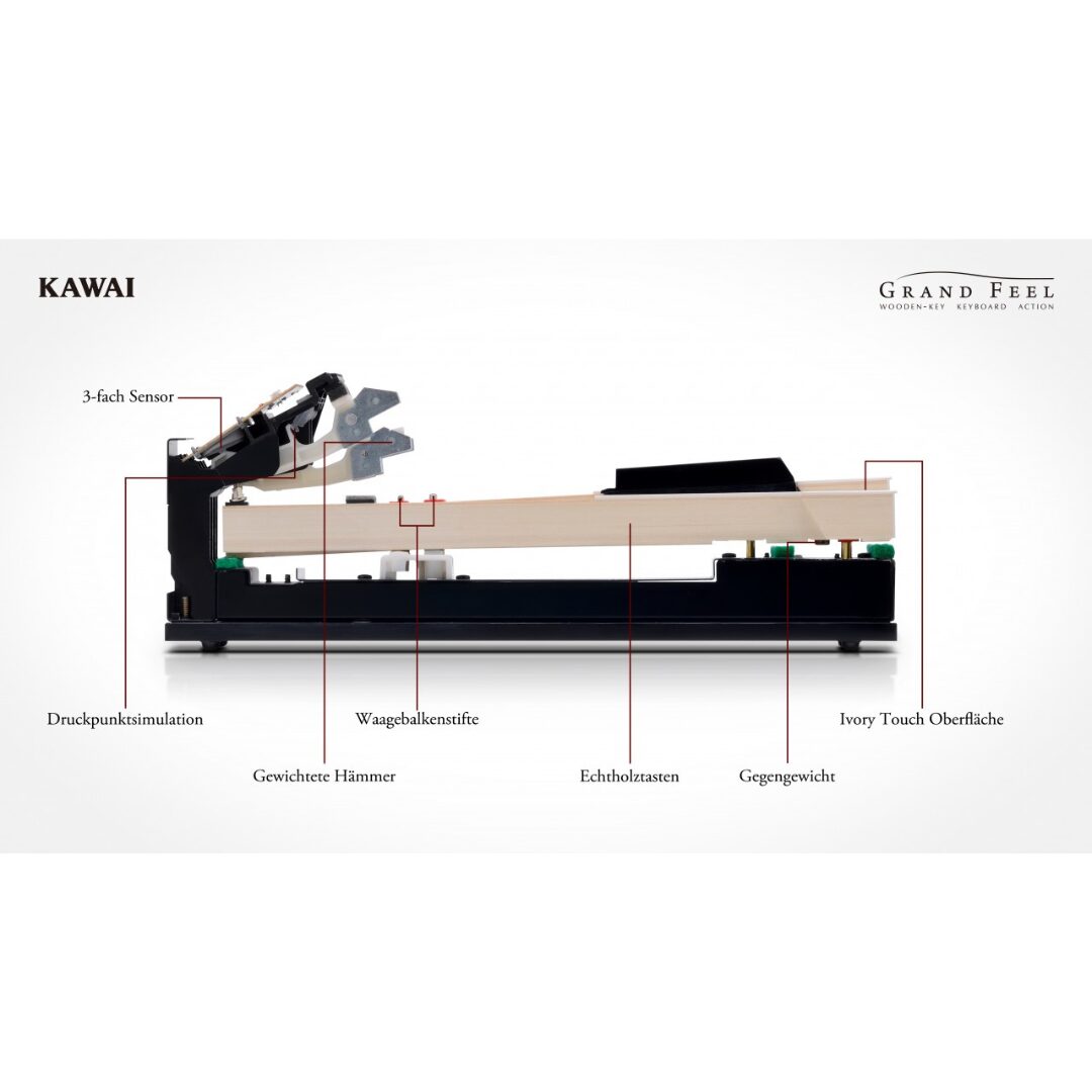 La mécanique avec touches en bois Grand Feel s’appuie sur plus de 90 ans de savoir-faire dans la manufacture de pianos acoustiques pour offrir une expérience de jeu exceptionnellement réaliste. Comme dans un piano à queue, les quatre-vingt-huit touches noires et blanches sont entièrement fabriquées à partir de longs morceaux de bois et reposent sur un pivot d’équilibrage pour reproduire le mouvement de balançoire d’une mécanique de piano acoustique. Les touches de la mécanique Grand Feel sont les plus longues de sa catégorie et la longueur de pivot correspond à celle d’un piano à queue Kawai. Lorsque vous appuyez sur l’avant d’une touche, l’arrière se soulève et lance un marteau qui joue la note. Ces marteaux sont gradués en taille et en poids pour reproduire le poids des touches basses plus lourdes et celui des touches aiguës plus légères d’un piano à queue acoustique. Les mouvements avant et arrière de chaque marteau sont mesurés avec précision grâce à la technologie à trois capteurs, permettant une répétition plus rapide des notes, une réactivité améliorée et un réalisme de jeu accru.