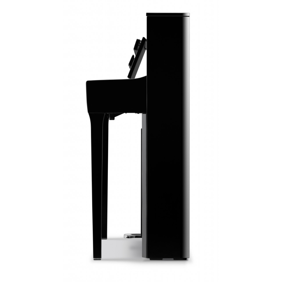 Le somptueux meuble du Novus NV6, finition noir brillant, est fabriqué dans la même usine que les pianos droits de la série « K » de Kawai, garantissant une qualité de fabrication exceptionnelle et un poli miroir impeccable. Son apparence extérieure s’inspire indéniablement du design classique des pianos, avec un couvre-clavier surmonté d’un large pupitre, offrant une impression de stabilité et de confort lorsqu’on s’installe au piano. Cependant, ce caractère traditionnel est modernisé et raffiné par les lignes légèrement courbées des bords, les élégantes jambes effilées, dépourvues des blocs massifs habituels, et divers autres détails qui allègent et actualisent l’allure de l’instrument.