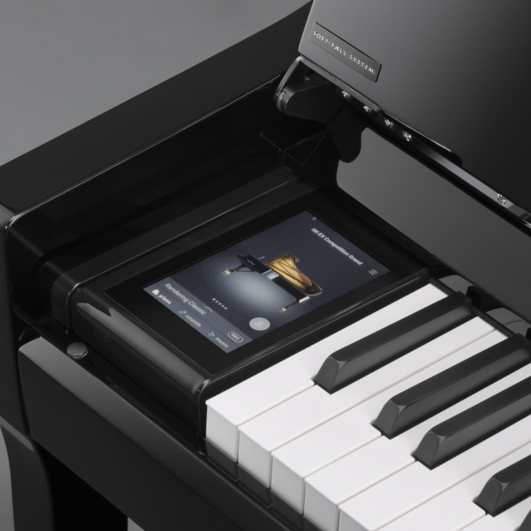Bien que les principales caractéristiques du Novus NV6 proviennent indéniablement d’un piano acoustique, l’instrument intègre également plusieurs technologies qui offrent le confort moderne d’un piano numérique haut de gamme. Ces fonctionnalités sont principalement contrôlées via l’écran tactile LCD du NV6, discrètement intégré dans le bloc gauche de l’instrument. Cet écran tactile haute résolution permet de sélectionner sons et réglages depuis une interface utilisateur attrayante, simplement en touchant ou en glissant le doigt sur l’écran. Pour les puristes du piano, l’affichage peut être configuré pour s’éteindre automatiquement pendant le jeu, préservant ainsi l’apparence classique du Novus et minimisant toute distraction visuelle pour le pianiste.