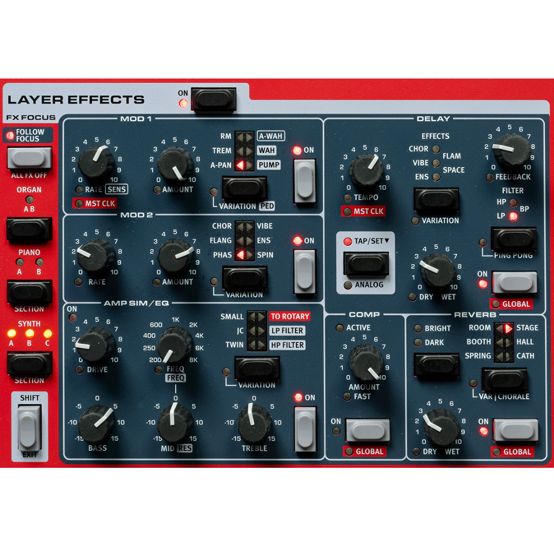 Le Nord Stage 4 dispose d’une nouvelle section d’effets très puissante offrant une configuration complète d’effets pour chaque module de son. La vaste gamme d’effets comprend un nouvel effet Pump : une compression en Side Chain contrôlable à la pédale ou en synchronisation au tempo, un nouvel effet Spin et de toutes nouvelles variations d’effets des Reverb, Delay, Amps et Modulation.