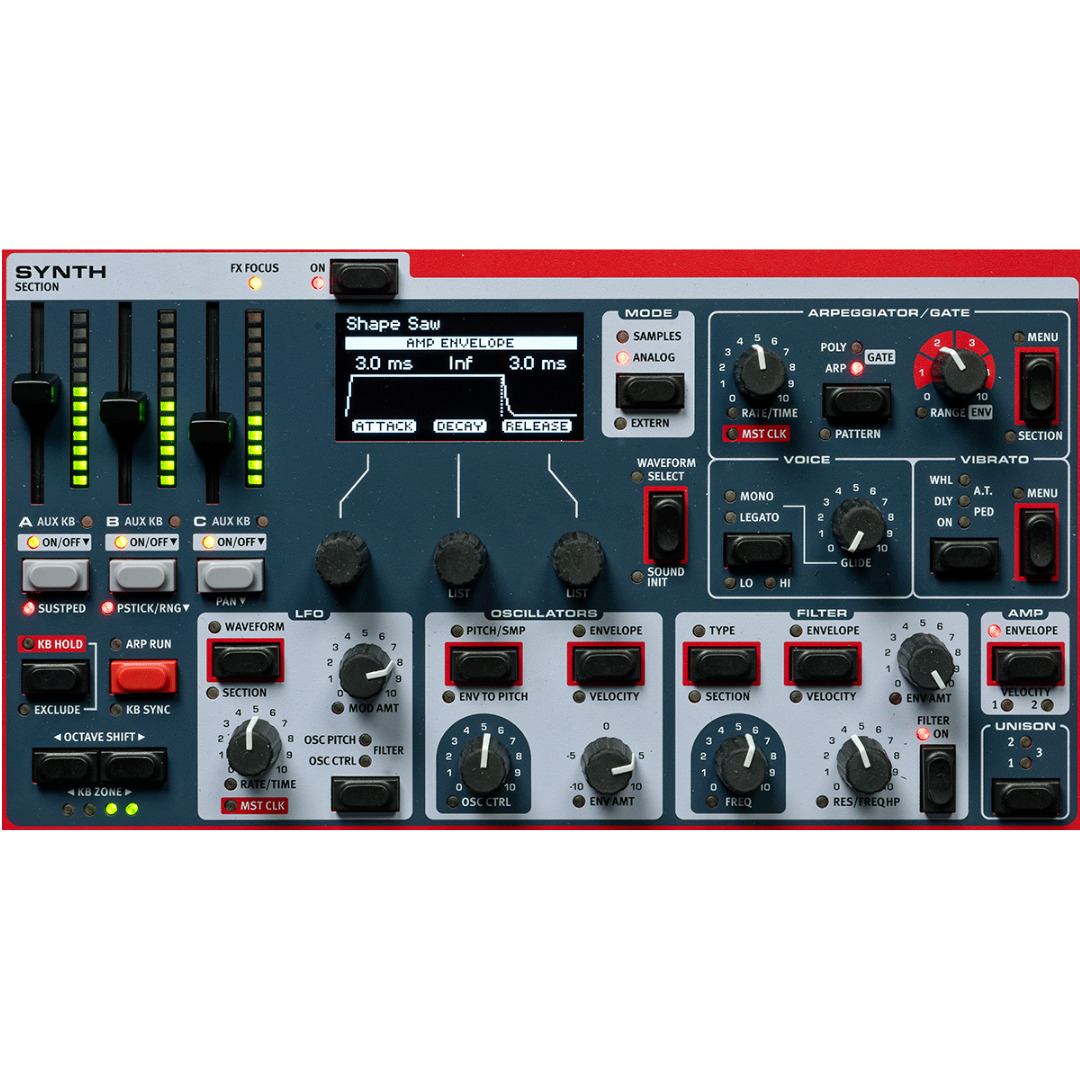 La section Synthé, avec ses trois couches indépendantes, est basée sur le puissant moteur de synthèse Nord Wave 2, qui embarque de la synthèse analogique virtuelle, des échantillons, de la FM et des tables d’ondes. Une nouvelle collection très complète d’échantillons issus de la bibliothèque d’échantillons Nord offre une large palette sonore de cordes, de basses, de chœurs, de guitares et bien plus encore. L’arpégiateur avancé dispose de nouveaux modes polyphoniques, Gate et Pattern et peut être utilisé pour une grande variété d’applications rythmiques avec des motifs personnalisables.