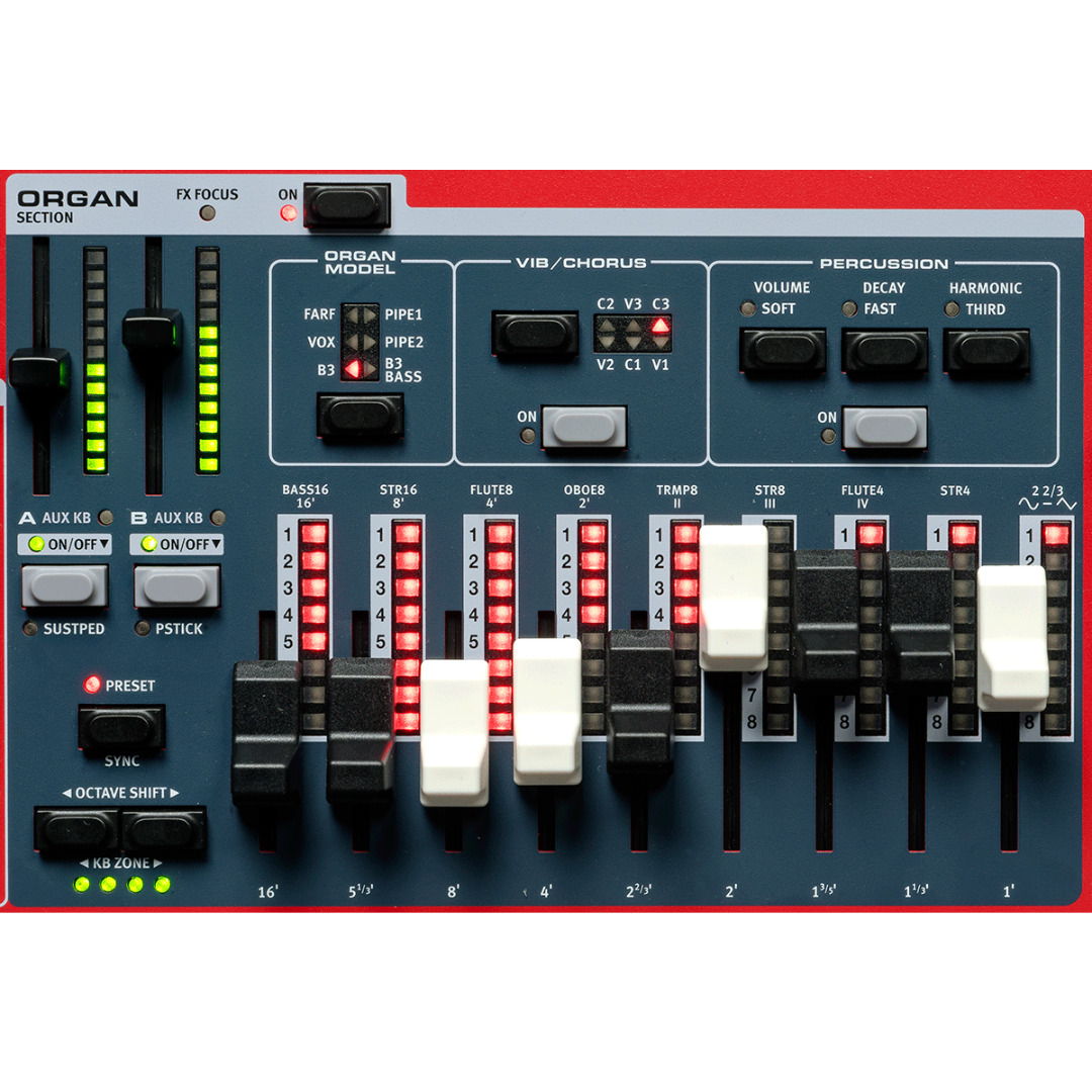 La section Orgue inclut les célèbres simulations d’orgue à roue phonique B3, de basse B3, de Vox et de Farfisa, ainsi que deux modèles d’orgue à tuyaux. Tous les modèles du Stage 4 sont équipés des nouvelles tirettes physiques avec indicateurs LED pour une expérience et une vue d’ensemble optimales.