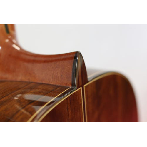 - L’ovangkol massif pour le dos et les éclisses, un parti pris pour la modernité et l’efficacité. Un bois qui se situe entre l’acajou et le palissandre pour un son riche, précis et étonnement puissant. Une table en cèdre canadien massive de chez Maderas Barber, grand spécialiste du bois de lutherie en Espagne, le tout sélectionné parmi ses stocks en séchage depuis de nombreuses années.