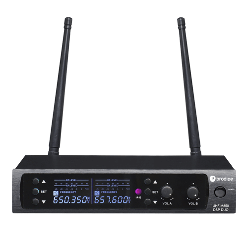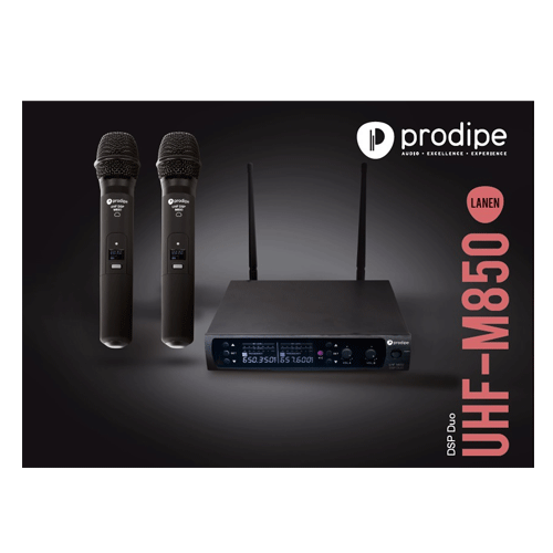 Quand Prodipe se met au service de la qualité et de la définition de votre son en UHF. Le système M850 DSP Duo est composé de deux micros main UHF avec écran d’affichage des canaux et bouton mute facilement accessible, d’un boitier de réception métal avec antenne BNC avec deux sorties symétriques sur XLR doublées par une sortie Jack asymétrique.